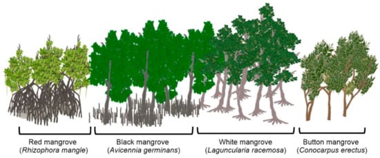 The physiognomy of the plant communities which surround the lagoon can be divided into tree-dominated and herbaceous species. Around the lagoon (Figure 1), there is a heterogeneous mangrove forest of about 190 ha, with a height range of 5–15 m and typical, associated plants [18]. Mangrove species found here include Rhizophora mangle (red mangrove), Avicennia germinans (black mangrove), Laguncularia racemosa (white mangrove) and Conocarpus erectus (button mangrove), with Avicennia and Laguncularia being the most abundant (88%) [15] (Figure 10). Between the 1980s and 2010, the area of the mangrove fell by 33.8%, although another 0.3% of mangrove area was converted from agricultural livestock to mangrove, between 2005 and 2010 [18].