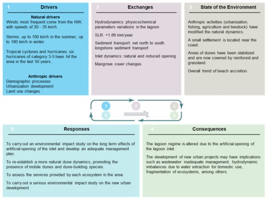 The Drivers, Exchanges, State of the Environment, Consequences and Responses (DESCR) framework is based on the Drivers–Pressure–State–Impact–Response (DPSIR) framework, which is considered a useful system for the organization and presentation of environmental sustainability factors [5]. DESCR is a variant of this methodology, in which, instead of analyzing the pressures, the bidirectional exchanges of fluxes of matter and energy with the environment are considered simultaneously, evaluating their natural dynamics and connectivity. These exchanges, in which the drivers modify the state of the environment and vice versa, are considered in this cycle, as suggested by [7]. This analysis of the exchanges reflects the intensity of the pressures that exist in the study area. The impacts are evaluated as consequences in the ecosystems and can be positive, negative or neutral [4]. This methodology was described in a study on coastal squeeze in Puerto Morelos, Mexico, as a tool to evaluate and manage the consequences of the phenomenon [4].