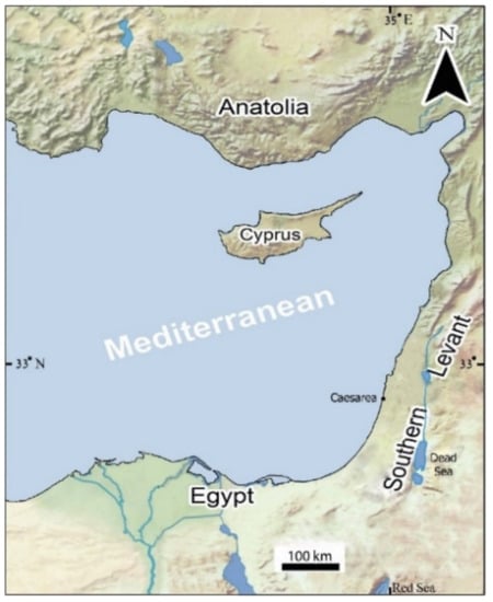 Location of the Caesarea study site. Modified by E. Galili after Natural Earth (www.naturalearthdata.com in the public domain, accessed on 25 March 2019).