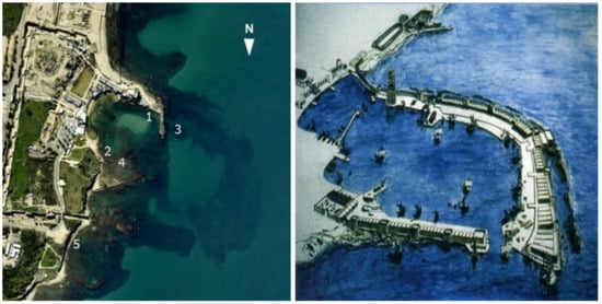 The Roman, Herodian harbor of Caesarea: left panel—aerial photo, right panel—artist reconstruction [43]. (1) Roman dock; (2) Roman dock; (3) submerged surface built of ashlars; (4) Crusader mole; (5) Beachrock deposits.