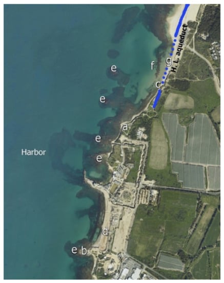 Figure 6. Aerial photo of the Caesarea coast: (a) the location of Straton Tower quay; (b) the rock-cut Roman palace pool; (c) the Byzantine sewer outlet; (d) the Roman circus and the location of the Late Roman-Byzantine urban-waste fill proposed by Goodman-Tchernov and Austin as a 6th and 8th century CE tsunami deposit [9]; (e) abrasion platforms; (f) beachrock ridge marking the Roman coastline; (g) the missing section of the aqueduct.