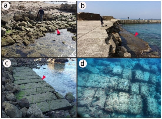 - Reinhardt, E.; Goodman, B.N.; Boyce, J.; Lopez, G.; van Hengstum, P.; Rink, W.J.; Mart, Y.; Raban, A. The tsunami of 13 December, A.D. 115 and the destruction of Herod the Great‘s harbor at Caesarea Maritima, Israel. Geology 2006, 34, 1061–1064. [Google Scholar] [CrossRef]