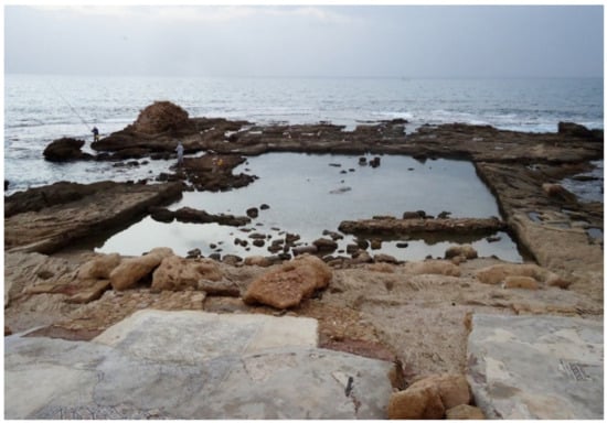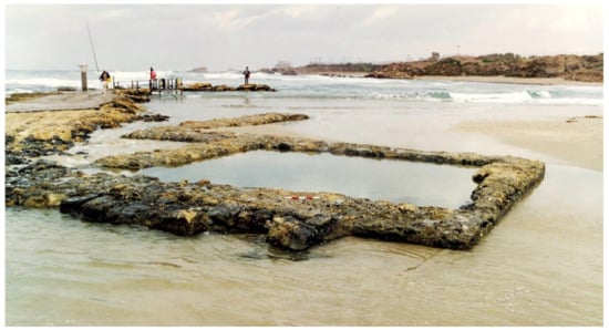 - Stone-built pool near Kibbutz Sedot-Yam—The rectangular stone-built pool that can be filled with sea water by gravity is currently at present sea level (Figure 6d and Figure 10). Given its building style and location (close to the southern Byzantine city wall), it can be dated to the Byzantine period. The structure could have served as a swimming pool.
