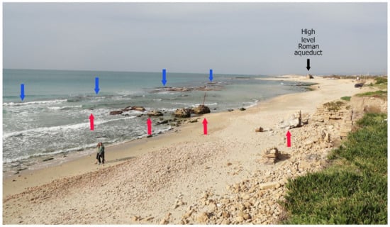 Figure 9. Byzantine sewer outlet on the coast and partly submerged in the northern anchorage (marked with red arrows, for location see Figure 6c), and a beachrock ridge designating the location of the coastline before the construction of the harbor (marked with blue arrows, for location see Figure 6f), looking north. - (7)