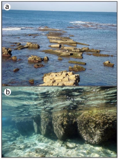 - The quay of the Hellenistic northern harbor of Straton’s Tower—The quay (Figure 6a and Figure 7a), described by Raban (pp. 82–84, [48]) is built of headers. It is at an elevation that still enables functioning today, suggesting stable sea-level conditions since the 2nd century BCE.