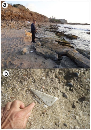 Figure 12. Beachrock north of the northern Crusader Wall: (a) general view looking south, (b) close up of a Roman marble item consolidated in the beachrock (for location see Figure 4 left panel marked with number 5). - (13)