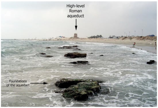 - Nir, Y. The destruction of the Roman high-Level aqueduct and the Herodian harbour of Caesarea. In Harbour Archaeology: Proceedings of the First International Workshop on Ancient Mediterranean Harbours, Caesarea Maritima, 24–28.6.83; BAR International Series pre-2020; Caesarea Maritima (BAR IS 257); Raban, A., Ed.; BAR Publishing: Oxford, UK, 1985; pp. 185–194. [Google Scholar] [CrossRef]