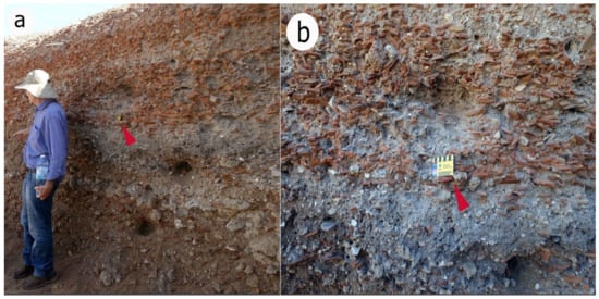 At a water depth of 10–12 m offshore, Reinhardt et al. (area W, [42]) identified beds of small angular shell fragments and potsherds dated from the 1st century BCE to the 1st century CE that were overlain by a layer of convex-up-oriented disarticulated bivalve shells. Relying on the fragmentation patterns and stratigraphy of the shells, the authors assumed that these shells could be related to the 115 CE tsunami deposits. Reinhardt et al. [42] also reported on the presence of articulated Glycymeris shells in the tsunami deposit, and suggested that these shells indicate transport from the deeper shelf, as the shallowest habitation depth for these bivalves is 18 m. However, no evidence for the presence of such articulated Glycymeris shells in the discussed deposits have ever been presented or published. Furthermore, Meinis et al. [85] noted that Glycymeris sp. (especially G. insubrica or violescens) were very common along the Israeli coast over long periods. They existed at different depths in a coastal environment (e.g., 8–16 m depth) and even at 200 m water depth. In the Adriatic Sea, their habitat was reported to be at a water depth of 2–40 m [86]. Moreover, Reinhardt et al. [42] give no explanation of how these articulated mollusks survived what they describe as the “…intense wave turbulence, shell-to-shell impacts, and shells striking the harbor moles or bedrock under high wave energy, as generated by a tsunami”. Given the above, there is nothing special in finding G. insubrica in sea bed sediments which are shallower than 18 m. The existence of articulated Glycymeris bivalves in the discased Caesarea deposits is yet to be proven, while the preservation of such articulated shells under a catastrophic tsunami that was assumed to destroy the Roman Harbor, is still to be explained.