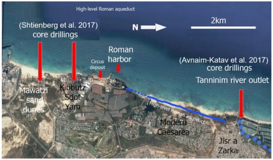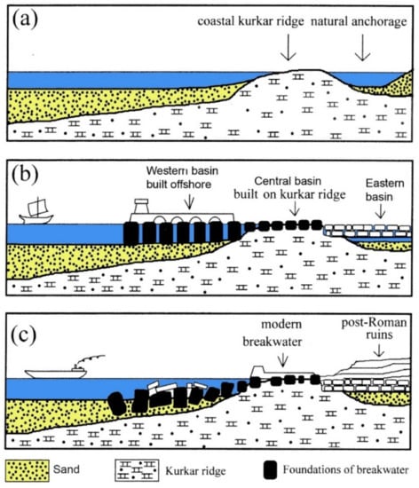 Figure 5. The Caesarea region: the western, central and eastern harbor basins (a, b and c, respectively, Table 1 [41,43]. - (2)