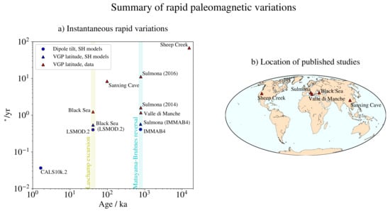 (a) Summary of rapid paleomagnetic variations from selected, published datasets (red symbols) and geomagnetic, spherical harmonics (SH) models (blue symbols). Circles and triangles indicate, respectively, maximum variations of dipole tilt and VGP latitude (see Section 2 for definitions), in degrees per year, over the timespan covered by the corresponding datasets or field models. Their location on the horizontal axis indicates the epoch at which the maximal variation was obtained (or reported). The sampling locations for the paleomagnetic datasets are reported in (b) and noted in both panels, and more information is available in relevant publications: Black Sea [,,], Sanxing Cave [], Sulmona Basin [,], Valle di Manche [] and Sheep Creek []. The geomagnetic field models IMMAB4 [], LSMOD.2 [] and CALS10k.2 [] have been sampled every 100 y for this calculation.