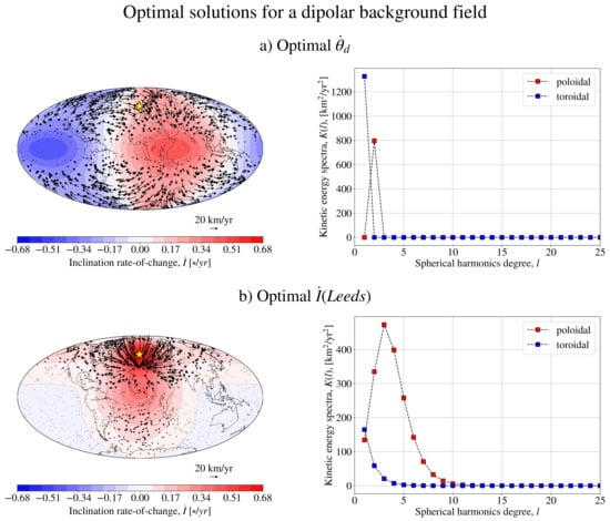 Flows that optimise the rate of change of (a) and I at Leeds (b) with a background magnetic field given by a dipole. All solutions were calculated for km/y and a background dipole intensity given by 29,410.65 nT. A small ( nT) horizontal component was added for the calculation of . The global plots on the left show the optimal flow and resulting global maps of . The plots on the right show energy spectra for the toroidal and poloidal flow contributions for the same choices of and . In all cases, .