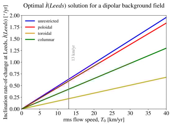 Rate of change of inclination at Leeds, , for optimal flow calculations with different geometries. The coloured, thick lines were obtained from optimal flow calculations with background fields given by an axial dipole described by 29,410.65 nT, for flows with the indicated geometry and for . The thin, vertical grey line marks the value km/y.