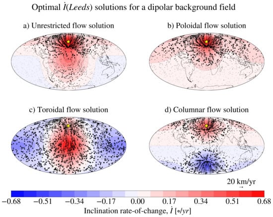 In Figure 3 and Figure 4, we show the effect of different flow geometries on the solution that optimises at Leeds. The background field is an axial dipole with = −29,410.65 nT. Inspection of Figure 3 reveals that, since it is the most general, the unrestricted flow is capable of the fastest rate of change for the same value of . Since the poloidal flow components dominate the toroidal contribution (see Figure 2b), the purely poloidal flow drives a rate of change that is not significantly lower than the unrestricted flow solution. As the allowed geometry becomes more restrictive, the flows cannot organise in the most efficient way, and the optimal decreases. The toroidal flows are incapable of upwelling/ downwelling, which are efficient structures for driving localised changes, and they produce a pattern of that is significantly (with respect to the value at the optimisation location) distributed across the globe. In the vicinity of the optimisation location, the optimal columnar flows are morphologically similar to the unrestricted solution, but they are forced to distribute energy in the Southern Hemisphere as well, producing a second region of rapid , which is equal in magnitude, but opposite in sign to (equatorially antisymmetric). Note that this is a consequence of the background field being equatorially antisymmetric: in general, an equatorially symmetric flow does not produce an equatorially antisymmetric inclination rate of change.