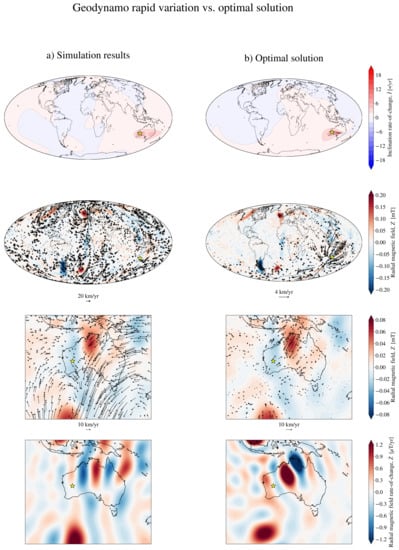 Locally, the differences in CMB flow morphology and intensity between the simulation output and the optimal calculation are reduced, in particular in correspondence with the patch of positive Z to the northeast of the projection of the optimisation location (see the third row of Figure 5). As a consequence of these similarities, the locally produced SV in the simulation and by optimal flows presents significant analogies. The bottom row of Figure 5 shows the radial SV as obtained via first differences from the simulation results (a) and from the optimal flows (b) via Equation (1). In both cases, the radial SV has a banded structure in the region below the yellow star, although the quantitative details differ. Furthermore, in agreement with the simulation results, the optimal flows produce the directional variations observed at the optimisation location by advecting a patch of strong outward field (the red patch below central Australia) westward.