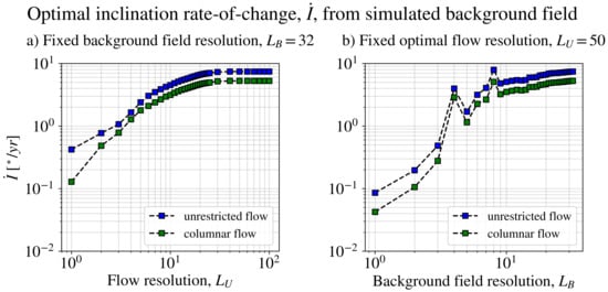 Convergence study for the optimal calculation of the inclination rate of change with the geodynamo simulation from []. The panels show the optimal inclination variation at the location marked by the yellow star in Figure 5, varying the spatial resolution of the fluid flows (a) and the spatial resolution of the background magnetic field (b). In all cases, the rms flow speed is fixed at km/y, the same value used for the results presented in Figure 5, for and .
