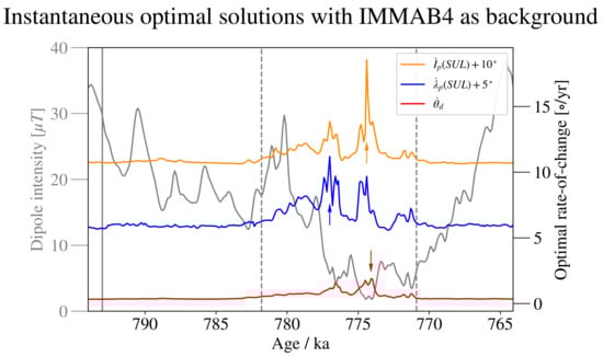 Time series of instantaneous optimal , and as calculated with the IMMAB4 field model as the background and for km/y. For the ease of inspection, the coloured curves were offset by the indicated amount, and the epochs of maximum optimal variations are indicated by arrows. The grey curve indicates the intensity of the dipole field as predicted by the IMMAB4 model. The vertical dashed lines represent the boundaries of the reversal period according to [], and the vertical continuous line indicates the epoch to which the plots on the left column of Figure 8 refer.