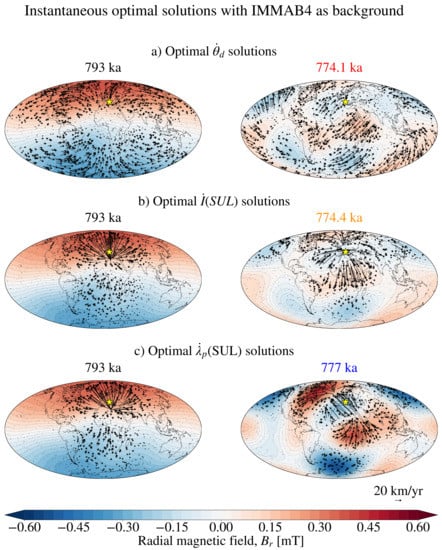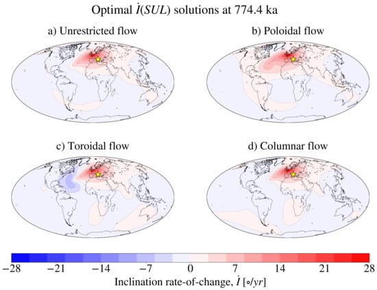 We now focus on the global inclination changes driven by flows that optimise . Figure 10 shows maps of the inclination rate of change driven by flows of different geometries that optimise with the values of required to reproduce the SUL16 values (see Figure 9a). Figure 10 shows that the SV driven by optimal flows with different geometries is morphologically similar. Most prominently, in all cases, the highest values of inclination variation are produced to the northwest of the SUL location (the yellow star). A wider area of high is furthermore located in the European region, which appears to corroborate the findings of anomalously high directional paleomagnetic changes in the Italian peninsula during the M-B reversal [,,]. Other qualitative features that can be reproduced by one or more flow configurations are a sharp dipolar feature located to the south of the Gulf of California (in particular, in the unrestricted and poloidal flows solutions), an extensive region of negative values over Antarctica, mostly positive values of over the entire Eurasian continent, an elongated region of positive values over South America and the South Atlantic ocean (see the unrestricted and poloidal flows solutions) and a patch of positive values over southern African (see the toroidal and columnar flow solutions).
