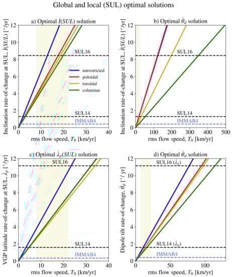 In line with what was discussed in Section 2 and Section 3, the optimal values shown in Figure 7 are linear in . This is illustrated in Figure 9, where we show the optimal rates of change for , and as a function of the rms velocity , as well as produced by the flow optimising , calculated at the epochs for which the optimal solution is maximal (see Figure 7 and Figure A2). The optimal solutions are compared to the values from SUL14 and SUL16 and to the highest, instantaneous rates of change predicted by the IMMAB4 model, also indicated in Figure 9 (see Table A1 for numerical values). Note that in Panel (d) of Figure 9, the optimal are compared to the SUL14 and SUL16 values of . The intersection of the coloured, continuous lines with the horizontal dashed lines provides the value required by optimal flows to reproduce the paleomagnetic observations SUL14 and SUL16. Figure 9 compares the locally observed SUL14 and SUL16 rapid changes with the variations produced by local and global optimal flows.