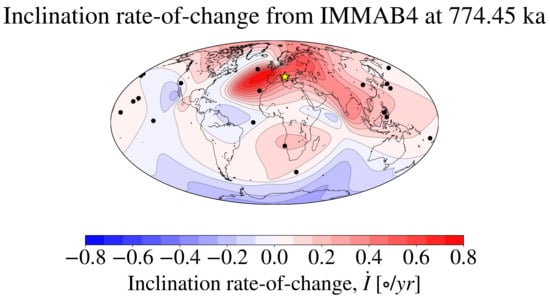 Analysis of lacustrine sedimentary records from the Sulmona Basin (SUL location), in Central Italy, suggest a subcentennial duration for the Matuyama-Brunhes (M-B) pole reversal [,], which took place at an epoch of about 780 ka. Specifically, Reference [] reported inclination and Virtual Geomagnetic Pole (VGP) latitudinal changes of from which the M-B reversal is estimated to occur in a fraction of a century. Strictly speaking, the lack of measurement of a transitional field indicated that the reversal occurred during an interval equal to or less than the temporal resolution given by the 2 cm thickness of the analysed samples. These considerations led the authors to refine the sampling to 0.3 cm in a subsequent study []. Again, no transitional field was recorded, leading the authors to conclude that the M-B reversal occurred over a temporal span of about y, requiring inclination and VGP latitudinal changes of . Whether the temporal resolution of the SUL stratigraphic record is suitable for paleomagnetic studies is debated [,]. However, independent reports of similarly rapid paleomagnetic directional variations exist [,,,,], compelling us to seek corroborative evidence for the existence of such extreme variations in the Earth’s past. In particular, on-land marine stratigraphic studies in Southern Italy [] corroborate the observation that the M-B reversal, as observed in the Mediterranean region, had a duration of the order of less than a century. Note that these studies are based on the measurement of locally defined quantities: the geomagnetic inclination and the VGP latitude (which requires knowledge of both inclination and declination). A geomagnetic polarity reversal can unambiguously be defined via global quantities, such as the geomagnetic dipole latitude, whose change in sign defines a global reversal. Although the dipole latitude and the VGP latitude are commensurable quantities, the latter is of a local nature and, depending on location, does not necessarily reflect the global behaviour of the planetary geomagnetic field.