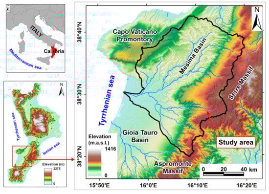 The Mesima basin extends for a surface of 806.4 km2 in Calabria region (southern Italy) and spanning from 38°42′35″ N to 38°19′35″ N of latitude and from 15°55′17″ E to 16°19′35″ E of longitude. (Figure 1). The Mesima basin represents the main fluvial catchment of the central part of the Calabria and its mouth flows in the Tyrrhenian sea on the south area of the Capo Vaticano promontory (Figure 1). The basin area is dominated by a hilly landscape on the central and western side, while, high mountains of Serre and Aspromonte Massifs characterize the eastern border. Elevation in the area ranges from 0 m to 1275 m a.s.l., with an average value of 400.5 m (standard deviation = 287.7 m). Slope gradient, computed from a 5 × 5 m DTM, ranges from 0° to 78.2°, with a mean value of 13.8° and a standard deviation of 11.1° [].