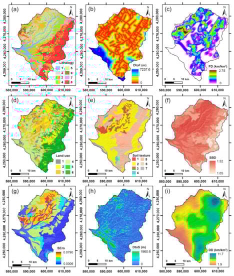 The occurrence of shallow landslide phenomena is closely influenced by the interplay of various geological, topographic, hydrological, and environmental factors [,,,,,]. Therefore, an important step to assess the landslide susceptibility is the selection of the predisposing factors, the understanding of their combined effects and the relative importance of the selected factors on landslides distribution. There is no common guiding principle for selecting the predisposing factors []. On the basis of the literature review, of the characteristics of the study area and of data availability, a total of 18 predisposing factors were considered in the study area for the analysis of shallow landslide susceptibility (Table 1). The predisposing factors include lithology, distance to faults, fault density, soil texture, soil bulk density, soil erodibility, distance to streams, drainage density, elevation, slope gradient, aspect, local relief, plan curvature, profile curvature, topographic position index (TPI), topographic wetness index (TWI), steam power index (SPI), and land-use.