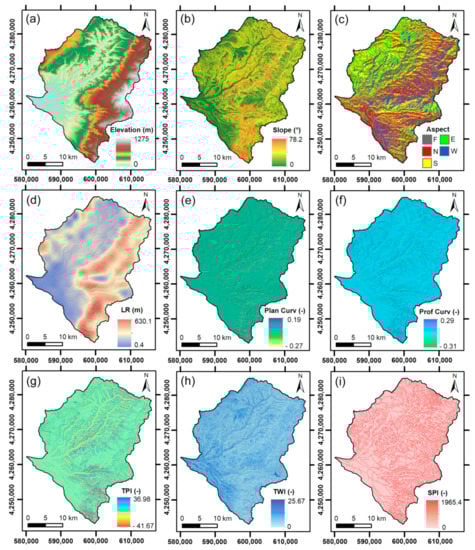 (a) Elevation map; (b) slope gradient map; (c) slope aspect map; (d) local relief map; (e) plan curvature map; (f) profile curvature map; (g) TPI map; (h) TWI map; (i) SPI map.