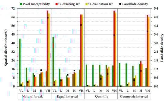The percentage values of shallow landslide susceptibility classes obtained by the four classification methods are summarized in Figure 6. The cross-comparisons of the susceptibility maps, in terms of the coverage differences among the recognized classes (Figure 6), indicate a marked difference of the employed classification methods. In particular, considerable differences were observed for the areal distribution mapped as very low susceptibility; whereas, the zones mapped with very high susceptibility are more similar. The outputs from the overlay of the susceptibility maps with the shallow landslide training and validation datasets are presented in Figure 6 as well. For the training dataset, the four maps generally display a gradual increase in the percentage of landslide cells ranging from ‘very low’ to ‘very high’ susceptibility class. However, the shallow landslides of both training and validation sets fall in the very high susceptibility class (Figure 6). In addition, landslide density was calculated to evaluate the best classification method to draw the shallow landslide susceptibility map of the study area [,]. The landslide density was computed using the ratio between the percentages of total shallow landslides and the percentages of each susceptible class. Obviously, greater susceptible classes should have higher values of landslide density in reliable landslide susceptibility maps []. Overall, the achieved outcomes showed lower values of landslide density in the very low and low susceptibility classes, and high landslide density in the very high susceptibility class for all the classification method (Figure 6). Therefore, the results indicate that the natural break is the most robust method for the classification of susceptibility map, because it showed the highest occurrence both of shallow landslides and of highest value of landslide density in the very high susceptibility class (Figure 6). Consequently, the final shallow landslide susceptibility map was realized according to the selected classification method (Figure 7a).