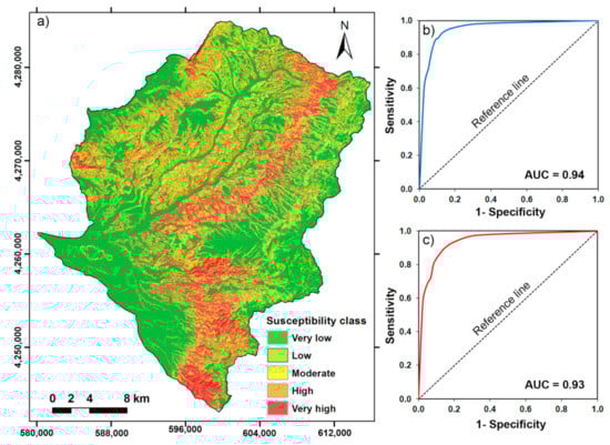 Determination of the accuracy of the SLSM and related susceptibility map were also achieved by plotting ROC curves and calculating their AUC values. The ROC curve was plotted both for the training and validation datasets (Figure 7b,c). The ROC curve of the training dataset indicates the success rate of the model and the reliability of the susceptibility map; whereas, the ROC curve of the validation dataset estimates the prediction rate and the accuracy of the susceptibility map. The analysis of ROC curve (Figure 7b,c) displayed an excellent performance of the SLSM both for the training and test datasets. In particular, at a confidence level of 95%, the ROC curve showed an AUC value of 0.94 for the training set and an AUC of 0.93 for the validation set (Table 8).