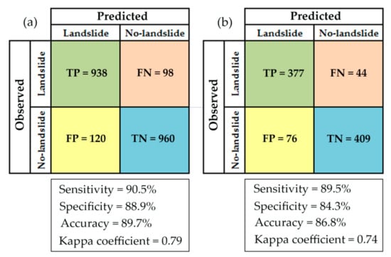 The kappa coefficient was calculated using the components of the confusion matrix []. The kappa coefficient (K) was used to evaluate the reliability of the model to classify the landslide pixels []. It was calculated as the proportion of the observed agreement beyond that occurring by chance, using the equation