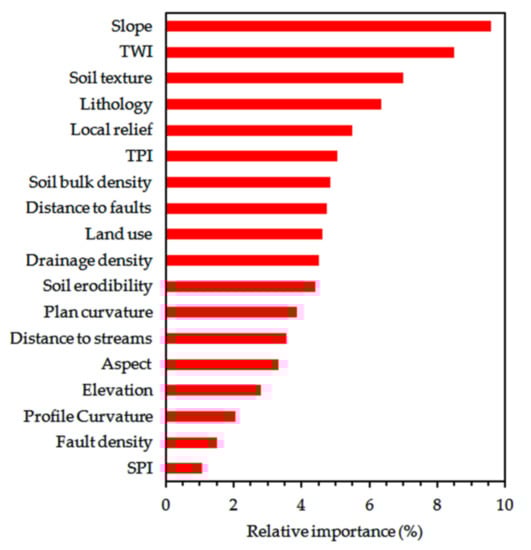 One of the important steps in the landslide susceptibility model is the selection of the predisposing factors and to identify which are redundant with respect to others []. The outcomes of the multi-collinearity test showed that there are not significant correlations among predisposing factors in the study area, consequently all predisposing factors were used to building SLSM. The results of multi-collinearity analysis are summarized in Table 4. The values of TOL and VIF indices for all 18 predisposing factors are >0.1 and <10, respectively. These results show absence of multi-collinearity problems among them. The VIF values of the selected predisposing factors range from 1.058 to 3.144, whereas for the TOL index, the values are included between 0.318 and 0.945 (Table 4).