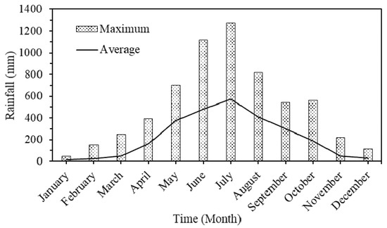 With a subtropical monsoon climate, Bangladesh is marked by various seasonal diversity in precipitation, temperature, and humidity. Bangladesh experiences about 80% of the precipitation during the monsoon [23]. The fluctuation in air pressure (low and high) which originates from differential heating of land and water results in the monsoon. During the warm months of summer (April and May), hot air blows over the Indian subcontinent, producing low-pressure areas into which cooler, moisture-bearing winds arrive from the Indian Ocean. This is known as the southwest monsoon. This monsoon begins in June and generally lasts through September. There are two branches of the monsoon, one which moves along the western edge of India, and the other which passes over the Bay of Bengal, eastern India, and Bangladesh. This monsoonal wind brings heavy rainfall to this region. Most of the notable landslides observed, took place at an increased amount of rainfall than the monthly mean amount. Usually, a rainfall intensity greater than 40 mm/day taking place over a short period of time is found to be closely related to the major landslide events of the CHT area [19]. Figure 1 shows the values of monthly average and maximum rainfall data in Rangamati, Chattogram station. The rainfall data were collected from the Bangladesh Meteorological Department (BMD). More than 75% of the annual rainfall occurs during the six months of May to October.