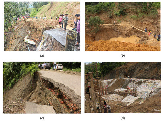 Figure 2. (a) Part of the Rangamati-Chattogram road collapsed at Manikchhari; (b) people had built a temporary solution after the local road had been damaged near the Rangamati-Khagrachari road; (c) heavily damaged Rangamati-Manikchari road; (d) temporary measures were taken on the Rangamati District road to reestablish the road network.