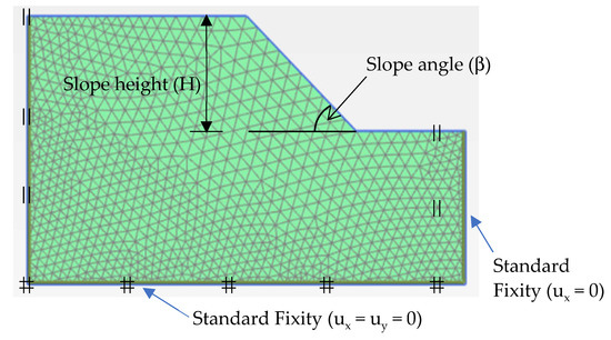 Standard fixities were applied as boundary conditions. These boundary conditions were selected according to the physical slopes. The bottom layer of the model was assumed to restrain all movements (vertical and horizontal) of the soil mass. The sides of the model were restrained against horizontal movement. The sides can only allow vertical movements along the z-direction. Initially, the global coarseness of the mesh was selected as standard coarse mesh (around 100 triangular elements). The mesh was further improved by convergence analysis of different mesh dimensions and mesh densities. A typical finite element mesh for evaluating the slope stability is shown in Figure 8.