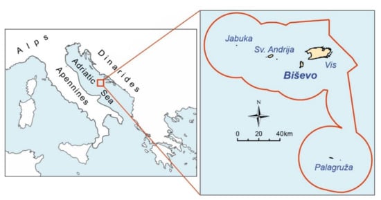 The island of Biševo is part of the Vis Archipelago situated in the central Adriatic Sea (Dalmatia, Croatia), comprising a few remote open-sea islands and numerous islets and rocks (Figure 1). According to the population census from 2011, the island of Vis had 3504 inhabitants, and it is the remotest populated island in Croatia. The whole archipelago was recognised as a potential geopark in 2016 [1] and declared by UNESCO as a Global Geopark in 2019 (https://geopark-vis.com/en/, accessed on 26 July 2021.). The archipelago deserves the status, because, in this relatively small maritime area (6661 km2) that comprises a few small islands, islets, and rocks (the land area is approximately 100 km2), there are five geological and geomorphological monuments of nature, two significant landscapes (Table 1), 70 recognised geosites, and many other natural beauties that should be offered to visitors in a sustainable organised way defined by the concept of UNESCO Global Geoparks.