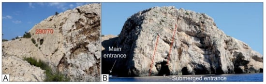 Exposure to the open sea in the present-day tidal zone of the coastline (Figure 1 and Figure 2) suggests an abrasion influence of the strong storm waves on fragmented host rocks in both caves. Although sea caves have been developed worldwide on comparably steep coasts and below coastal cliffs of various lithology on recent or former coastlines (e.g. [29,30]), the abrasion forming model of typical sea caves cannot be considered the only model on the coastline of Biševo. Therefore, predominantly tectonically defined fragments of the host rock were subsequently collapsed and eroded, and the cave is still forming through abrasion and corrosion processes.