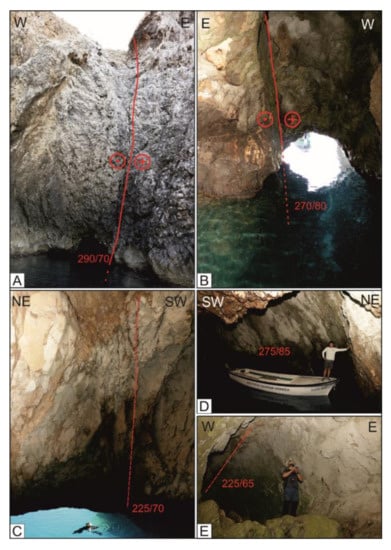 On the photographs of the Blue Cave, structural measurements are marked. The red lines mark fault planes. The dashed lines represent fracture system planes. Dip direction/dip angle is marked by red numbers. (A) The main entrance into the Blue Cave with a marked strike-slip fault (sinistral). (B) The main entrance photo, taken from inside out, with marked fault plane. (C) The submerged entrance and marked fracture system. (D) The fault plane on the southwestern wall of the Blue Cave. (E) Fracture system in a small dry channel on the NE part of the cave.