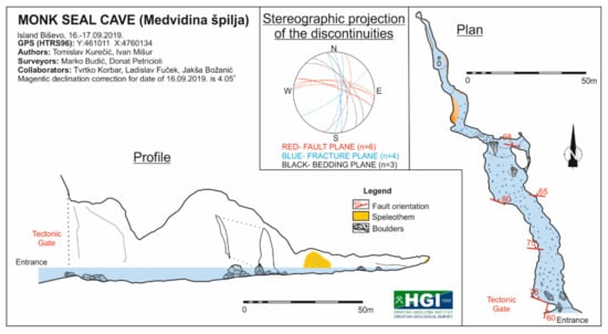 Plan and profile of the Monk Seal Cave (Medvidina špilja) (cave symbols according to [23,24]), with marked orientations of the bedding and fault planes. Stereographic projection (top centre) of all measured discontinuities on the surfaces and in the cave (lower-hemisphere projection).