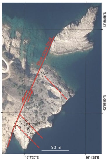 The island is intersected with numerous faults and fractures, mostly related to the NNE–SSW striking strike-slip Biševo fault system and the conjugated faults and fractures [3]. The tectonic lineaments, in combination with lithology, highly influenced development of the geomorphology of the island. The prominent valley in the central part of the island strikes along the main fault zone (Blue Cave fault) and the outcrops of rocks that are more prone to weathering (e.g., Biševo fm.). At the same time, the ridges are composed of fully cemented and less tectonised carbonates. The tectonic features are probably associated also with a complex salt diapir that is supposedly in the subsurface of the island [15] but is still underexplored.