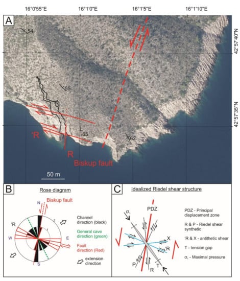 (A) Satellite image of the Monk Seal Cave area, with overlapped plan of the cave (black outline). The red lines mark the faults observed on the surface concordant with those measured in the cave (Riedel shear system, R—synthetic, ‘R—antithetic). The black mark indicates strike, dip direction, and dip angle (number) of the bedding (same as in Figure 2). The satellite image was acquired from http://www.arkod.hr/, accessed on 4 July 2021. (B) Rose diagram, where black triangles represent the direction of the channels in the cave, and red transparent triangles are the direction of the fault planes inside of the cave. In the diagram, the Biskup fault is also marked with a red dashed line. The green dashed line is the general direction of the cave. (C) Schematic idealised Riedel shear structure system according to [25,26].