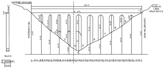 It is a masonry bridge consisting of the abutments and nine hollow piers (‘Torri’) founded on emerging rock and linked at their top by pointed arches. The geometric characteristics of the bridge are shown in Figure 2 [27].