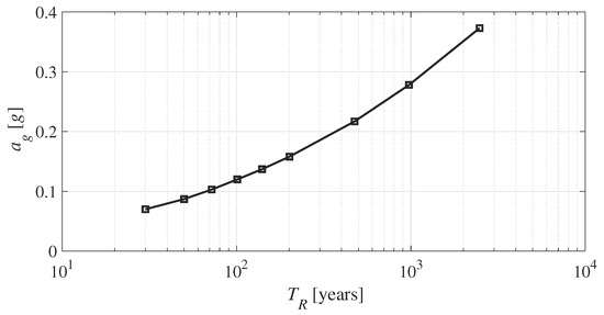 Italy is one of the countries with the richest macroseismic observations catalogues. Using the most up-to-date [32], starting from 1000 AD, for the town of Spoleto, it is possible to find a list of 36 observations whose locally felt intensity is above the damage threshold ( V Mercalli-Cancani-Sieberg, MCS). The maximum intensities at the site are IX-X, recorded in 1328, and IX, recorded in 1730. A set of 20 earthquakes was selected as representative of the seismic history of the site and reported in Table 1 ( = moment magnitude, d = epicentral distance) [33]. The expected maximum horizontal ground acceleration specified by the Italian Building Code [34] for the site and type A soil is reported in Figure 3 as function of the return period . In particular, for years, corresponding to medium seismicity.