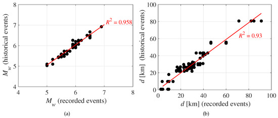 Correlation between historical events and recorded events reproducing the seismic history in terms of: (a) magnitude , (b) epicentral distance d.