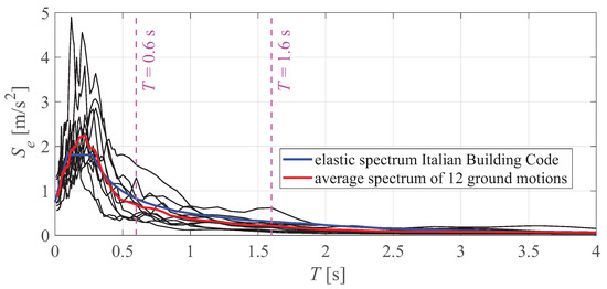 The spectral compatibility of the selected accelerograms was investigated by comparing the average response spectrum of the 12 selected records with the spectrum provided by the Italian Building Code [34] for the site. The 20 seismic events range from since 1246 up to 2016, for a return period equal to 40.5 years. In Figure 5, the acceleration spectra of the 12 records, together with their average spectrum, are compared with the acceleration response spectrum of the Italian Building Code for a return period of 35 years and soil type A. In the range between and (significant for the analyzed structure), the shape of the average spectrum is similar to that of the Code spectrum. Although the ordinates of the average spectrum are 20–30% lower, the set of the 12 selected records was considered sufficiently accurate to reproduce the seismic history of the site on the basis of the correlations on magnitude and epicentral distance.