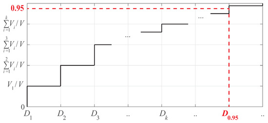 only accounting in the numerator of the integral for the region where , with V being the structural volume. To be noted is that the introduced global index does not provide information on the spatial damage distribution but is a scalar measure of the damage severity able to follow the progression of the degrading process in the structure. Other definitions could be adopted as an alternative to Equation (9), which provides an average measure of the overall damage and does not detect the maximum levels reached in localized zones. An evaluation based on the 95% fractile seems to be an effective option because it is closer to maximum local damage. Its evaluation is schematically depicted in Figure 6. Here, the values of damage () evaluated at all integration points of the FE mesh are reported in abscissa and related to the corresponding ratio between the accumulated volume, where that damage level is reached, and the total structural volume V. Hence, the global damage index is determined as the value that is not exceeded in the 95% of the entire volume.