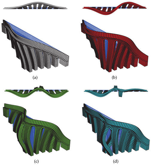 ‘Ponte delle Torri’: first four modal shapes corresponding to the frequencies in the first row of Table 3: (a) mode 1, (b) mode 2, (c) mode 3, (d) mode 4.