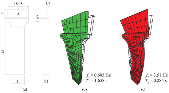 Equivalent pier: (a) geometry (dimension in m), (b) mode 1, and (c) mode 2.