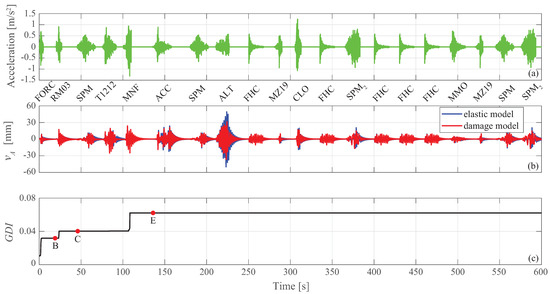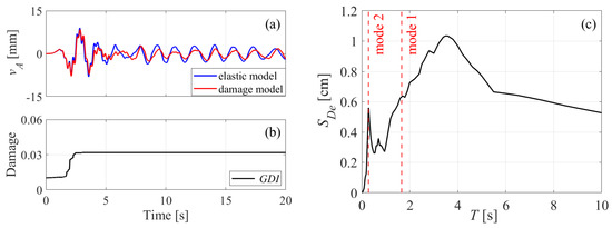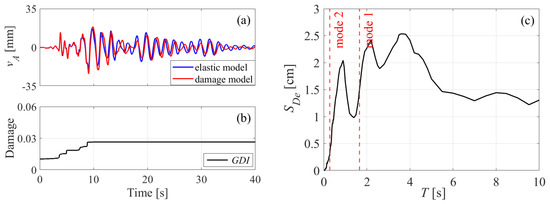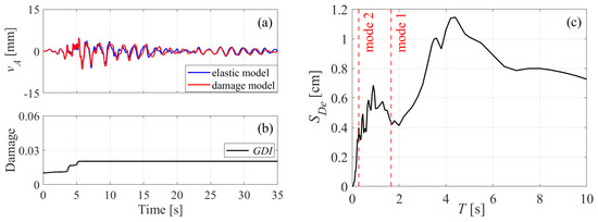 The dynamic response of ‘Ponte delle Torri’ to the accelerograms listed in Table 2 is simulated using the equivalent pier model introduced in the previous section. The masonry compressive strength, , is set equal to according to the experimental results collected in Reference [31], whereas the tensile strength, , is assumed equal to . These values lead to a typical ratio for masonry material, usually ranging between and . The characteristic length is set equal to . The material mechanical parameters are reported in Table 4. Two-stage analyses are performed: first, the structure is subjected to self-weight, and then the ground acceleration is applied along the bridge out-of-plane direction. The structural response is monitored in terms of out-of-plane displacement of point A, , located at the top side of the pier, as indicated in Figure 8a. To be noted is that the displacement induced by the application of self-weight is not represented in the time histories of the displacement reported in the following. Figure 9a, Figure 10a, Figure 11a, Figure 12a, Figure 13a, Figure 14a, Figure 15a, Figure 16a, Figure 17a, Figure 18a, Figure 19a and Figure 20a show the significant part of the response obtained by applying each accelerogram, starting from the pier undamaged configuration, with the aim of highlighting the effect of the onset of degrading mechanisms and better understanding the influence of accumulated damage during the seismic sequence. To this end, the responses evaluated assuming a linear elastic constitutive behavior for the material (blue lines in Figure 9a, Figure 10a, Figure 11a, Figure 12a, Figure 13a, Figure 14a, Figure 15a, Figure 16a, Figure 17a, Figure 18a, Figure 19a and Figure 20a) are compared with those obtained for the damaged structure considering the damage model described in Section 4 (red lines in Figure 9a, Figure 10a, Figure 11a, Figure 12a, Figure 13a, Figure 14a, Figure 15a, Figure 16a, Figure 17a, Figure 18a, Figure 19a and Figure 20a).