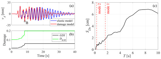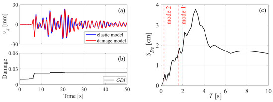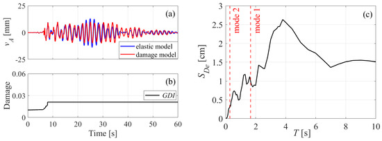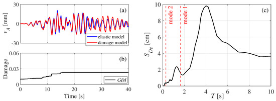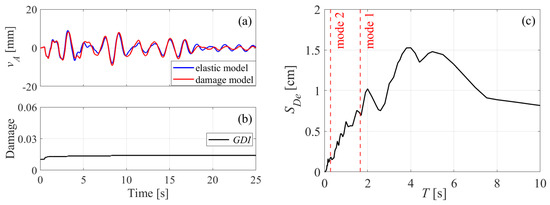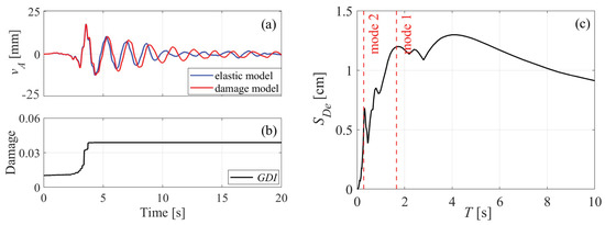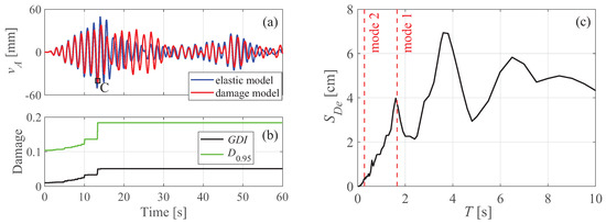 The lowest displacement amplifications are detected in cases of the FORC, FHC, and MMO records. In fact, although characterized by high values of the (, , and , respectively), their response spectra show low values (lower than ) in correspondence of the structural periods (see Figure 9c, Figure 16c, Figure 20c). In general, it emerges that earthquakes with comparable response spectrum ordinates (consider also RM03-SPM and T1212-MNF-ACC-SPM) lead to similar maximum displacements, regardless of their values. This confirms that the ratio between the forcing and natural frequencies plays a significant role on the dynamic response amplification, and the overall behavior is influenced by several factors highly correlated with each other. Even more complex is the interpretation of the structural response when the nonlinear phenomena are accounted for: displacements can be reduced or amplified with respect to the elastic case, depending on the combination of various phenomena [10,41]. Indeed, the onset and evolution of damage modify the structure mechanical properties, making it more flexible; thus, the structural natural periods increase, as a consequence. Correspondingly, the ordinates of the displacement spectrum may either increase or decrease, depending on the frequency content of the accelerogram.