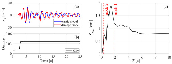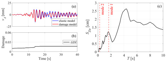 Earthquake ACC station: (a) elastic and damage responses of the equivalent pier, (b) evolution of the , (c) elastic displacement spectrum.