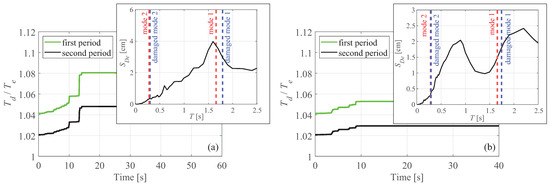 The comparison of the maximum attained displacements in the elastic and nonlinear cases can, again, be better understood referring to the displacement spectra in Figure 9c, Figure 10c, Figure 11c, Figure 12c, Figure 13c, Figure 14c, Figure 15c, Figure 16c, Figure 17c, Figure 18c, Figure 19c and Figure 20c. Let us focus on the responses to some representative earthquakes taken as example. Under the ALT accelerogram, the pier response significantly involves the first mode of vibration, whose period () increases at the onset of damage, likely moving the structure towards the decreasing branch of the displacement spectrum. This causes the reduction of the dynamic amplification with respect to the elastic case. Conversely, increment of the maximum response emerges in case of T1212 record when damage is activated. As a matter of fact, the corresponding displacement response spectrum (Figure 12c) shows increasing branches near the main periods of the structure. To better clarify, in Figure 21a,b, the variation of the first two periods of the damaging structure (), normalized with respect to the elastic ones (), are plotted for ALT and T1212 earthquakes, respectively. These are derived from a step-by-step modal eigenvalues analysis, performed on the basis of the damaged stiffness matrix. Progressive increments of the natural periods emerge in the first part of the loading histories, and then these stabilize at constant values when the evolution of damage stopped. The final values of the damaged periods are also indicated with dashed blue vertical lines in the most significant part of the displacement response spectra shown in Figure 21, further validating the reported considerations.